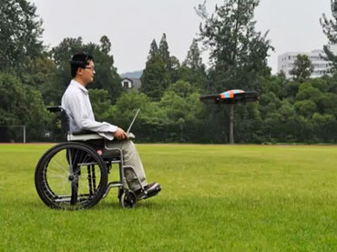 The video shows a man in a wheelchair using the technology to get a closer view of flowers, to take pictures and even to guide his drone through a battle with another quadrotor controlled through a handheld remote control. Needless to say, mind triumphs over matter and the hand-managed drone is hustled off the mat by its thought-controlled analog.