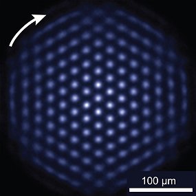 Ion trap: Under the right experimental conditions, the ion crystal spontaneously forms this nearly perfect triangular lattice structure. (Source: Britton/NIST)