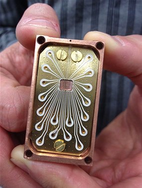 Silicon: Andrea Morello holds a circuit board that can contain a small piece of specially manipulated silicon (Source: Stephen Pincock)