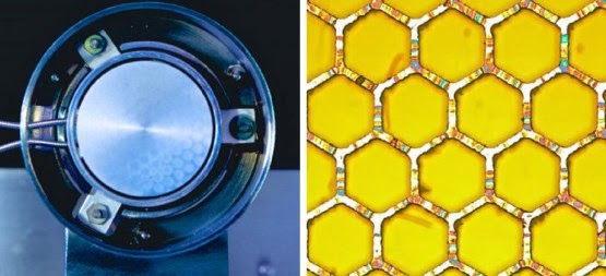 | Emitter (left) and hexagonal micrograph of the W-grid used as gate (right) |